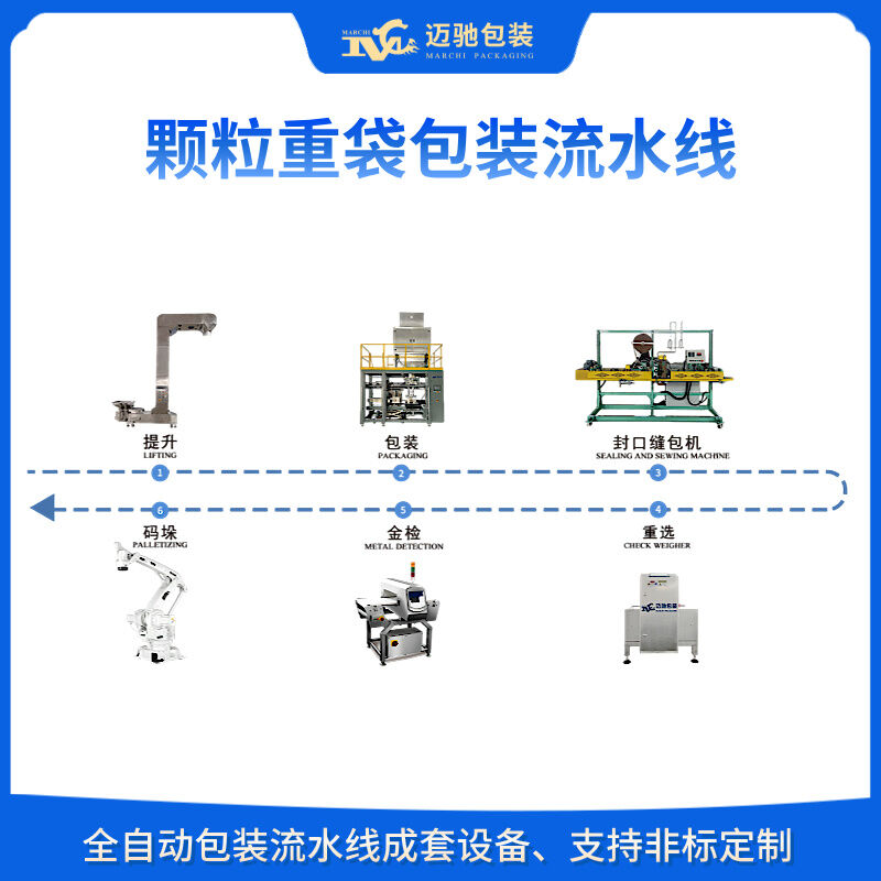 迈驰,是一家专业生产全自动颗粒重袋包装流水线的生产厂家,无扬尘、高精度,可根据物料不同特性定制包装流水线设备,一对一定制化服务,26年包装行业经验助力生产企业将本增效,提高产能。